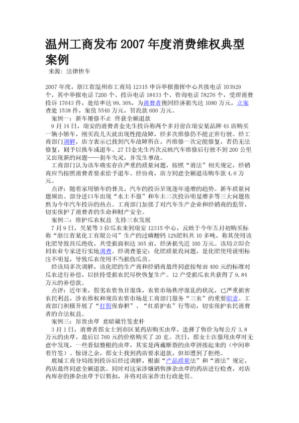 溫州工商發(fā)布2007年度消費(fèi)維權(quán)典型案例