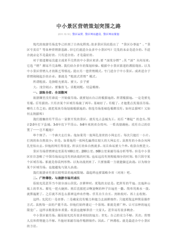 作為一個(gè)中小的旅游景區(qū),如何實(shí)現(xiàn)經(jīng)營策略的突圍,我想應(yīng)從以下幾個(gè)方面入手。 ● 經(jīng)營思路的突圍 作為一個(gè)旅游景區(qū)的經(jīng)營者,必須有一個(gè)對(duì)企業(yè)發(fā)展戰(zhàn)略的遠(yuǎn)景...