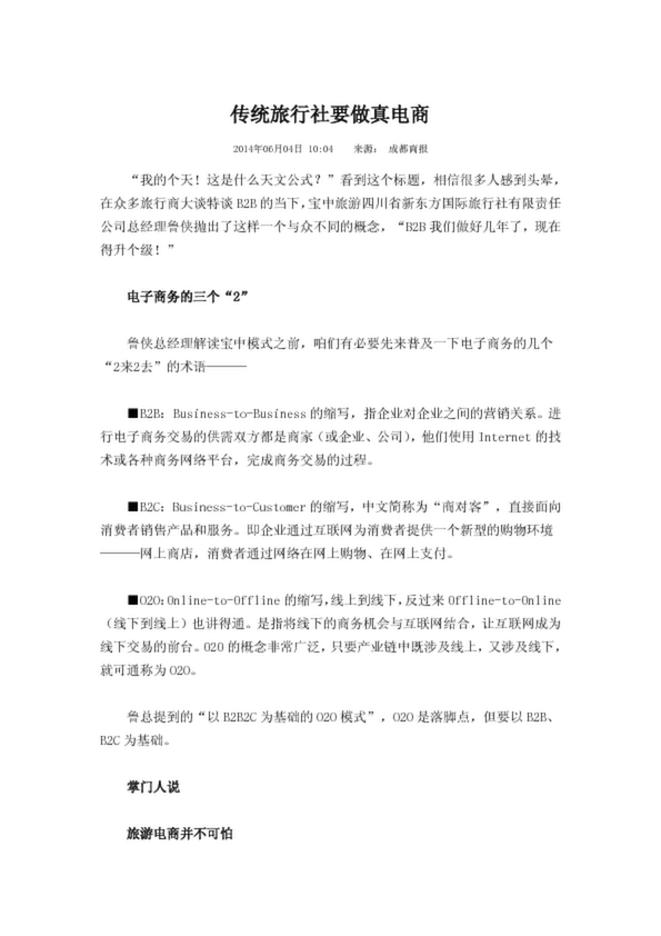 傳統(tǒng)旅行社把信息技術(shù)巧妙地運(yùn)用到自己的生產(chǎn)經(jīng)濟(jì)各個環(huán)節(jié),運(yùn)用好了就是優(yōu)秀的旅游電子商務(wù)。 目前,傳統(tǒng)旅游受到前所未有的沖擊,很多傳統(tǒng)旅游企業(yè)也開始嘗試向旅游電子商務(wù)轉(zhuǎn)型,但這些企業(yè)對旅游電子商務(wù)了解甚少,再加...